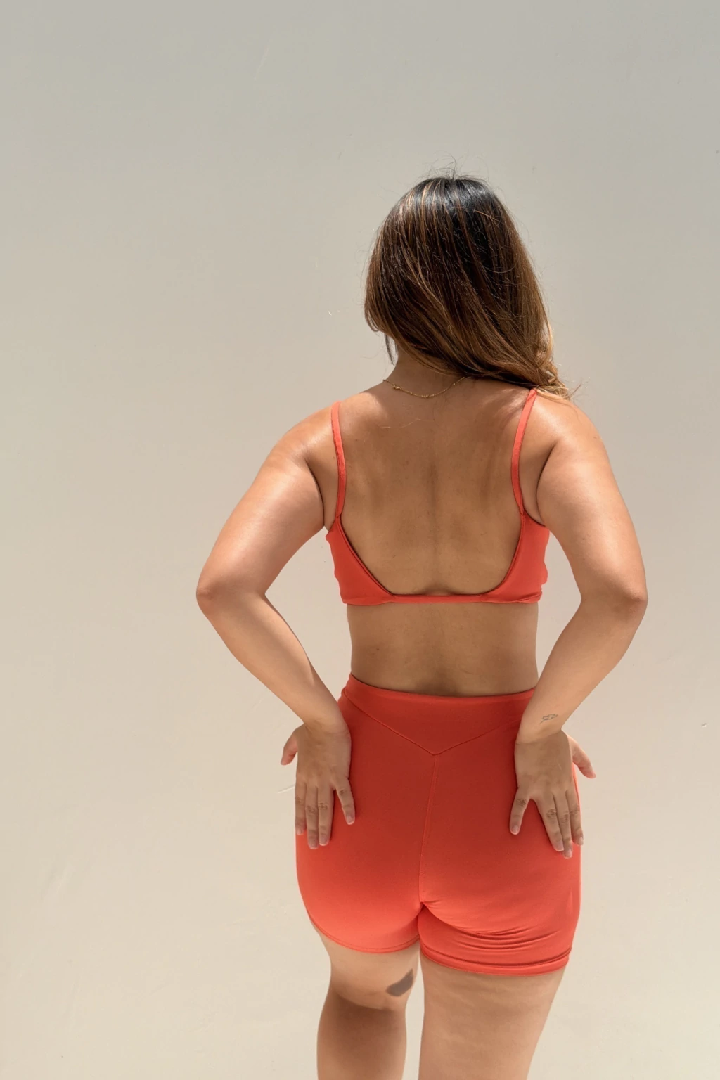 O Conjunto Vitta foi desenvolvido em tecido de média compressão com elasticidade multidirecional, garantindo suporte equilibrado, conforto absoluto e liberdade total de movimento. Sua modelagem minimalista com linhas limpas valoriza o corpo sem limitar, entregando um caimento leve e moderno para treinos ou uso casual. O top apresenta alças finas reforçadas, que oferecem sustentação segura com sensação suave sobre os ombros. A parte posterior possui decote mais baixo, trazendo respirabilidade e elegância. O short de cintura alta entrega firmeza na medida certa e efeito modelador natural, além de se ajustar ao corpo com suavidade, sem marcar. O tecido é macio, respirável, possui secagem rápida e proteção solar UV 50+, ideal para práticas como musculação, cardio, corrida leve ou para compor looks confortáveis no dia a dia.