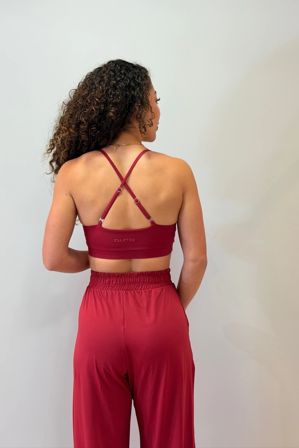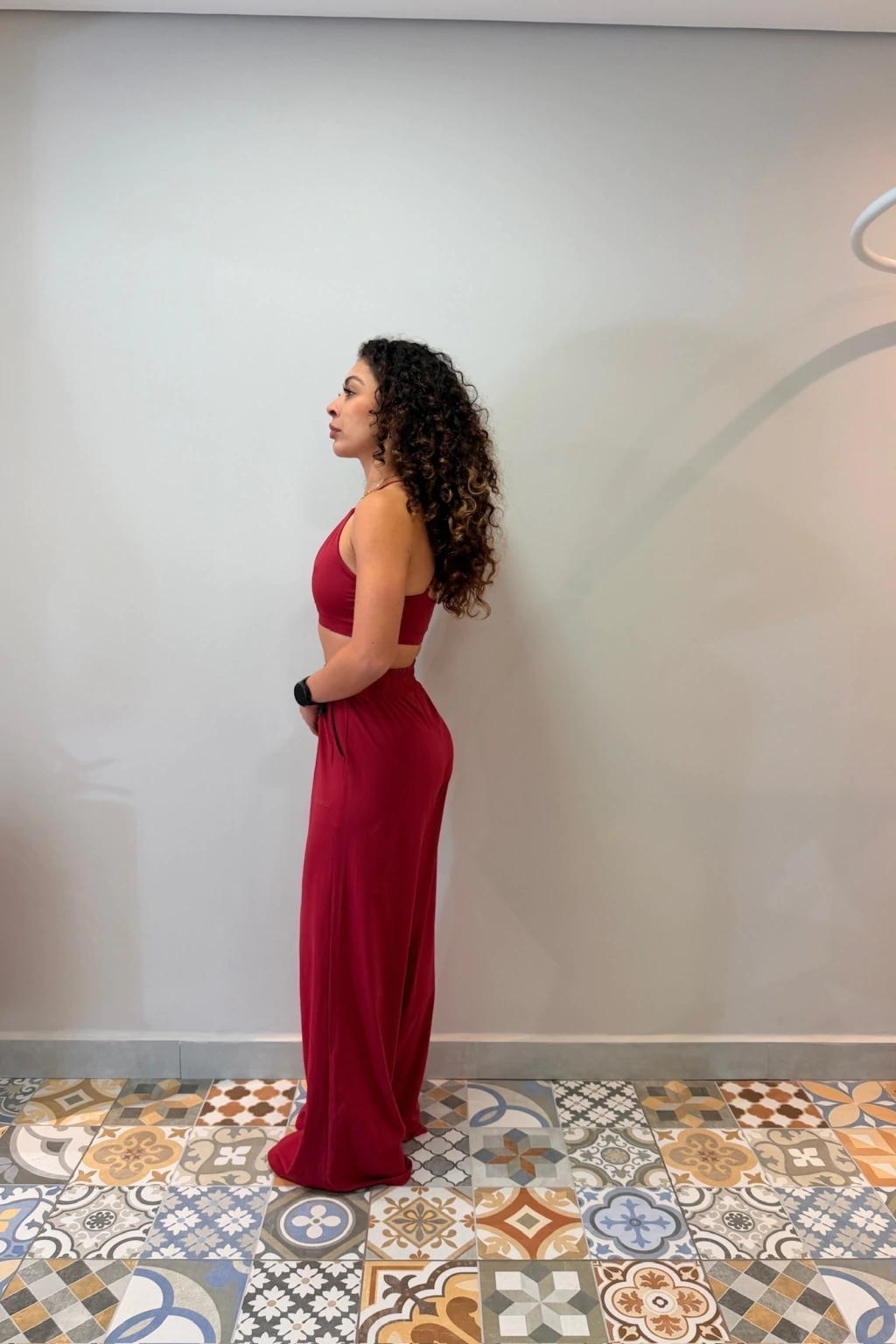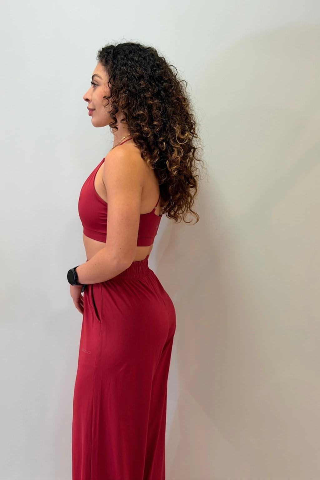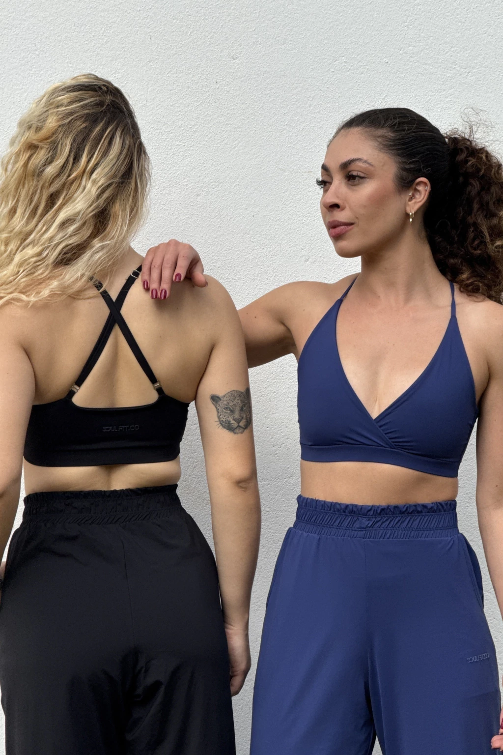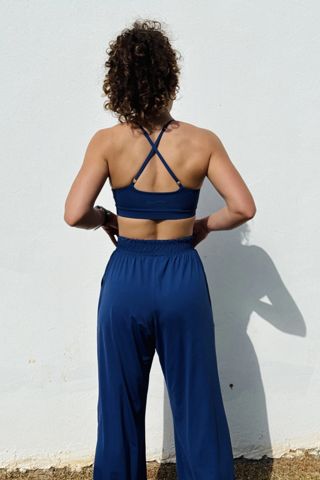 Top cruzado com ótima sustentação, que valoriza e eleva o colo com conforto. A calça pantalona tem tecido fluido, caimento impecável e bolsos funcionais. Um look casual, estiloso e versátil para te acompanhar do dia a dia ao pós-treino.